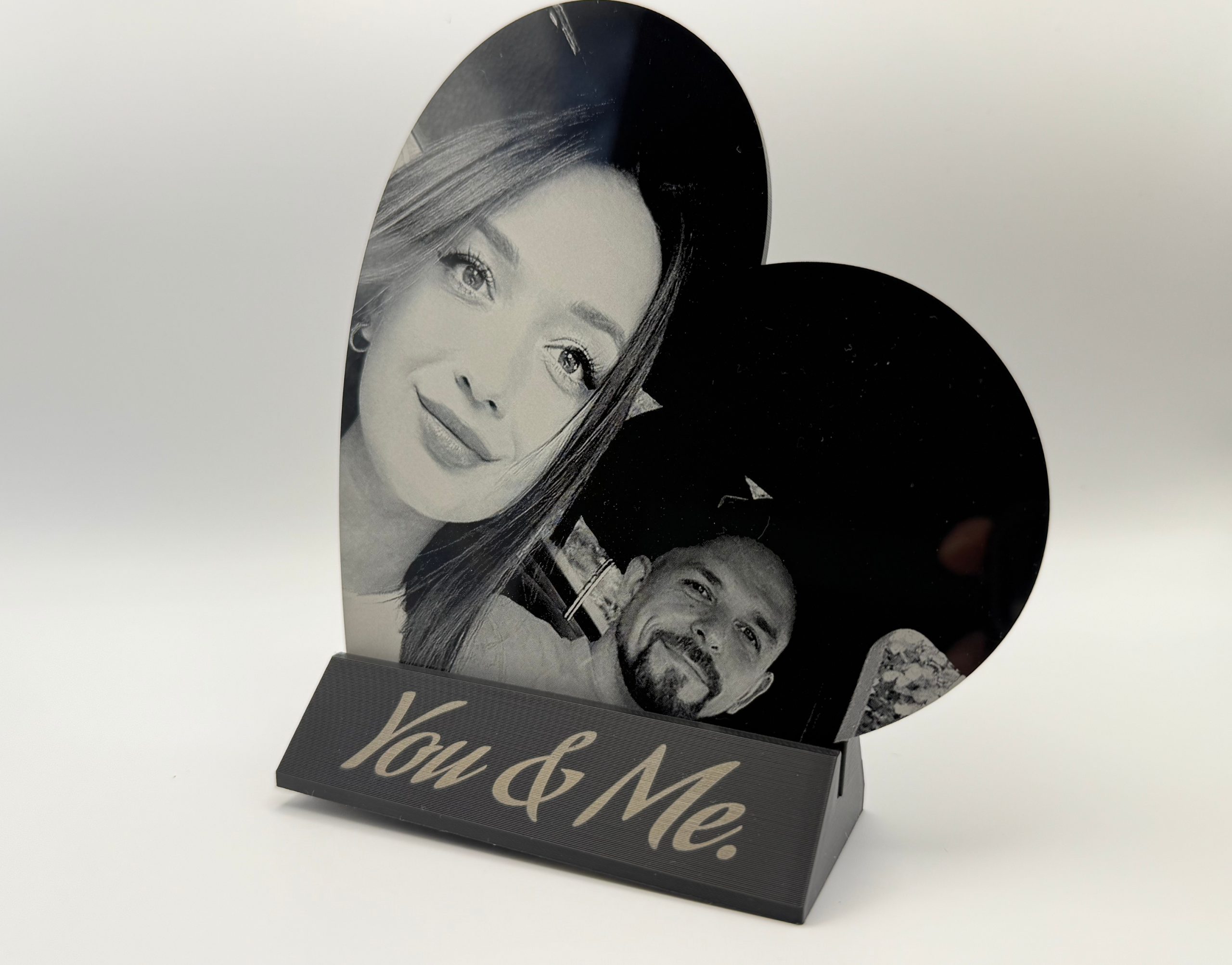 Each piece is custom engraved from your photo and displayed on a solid premium stand, creating an elegant, modern gift that lasts forever.