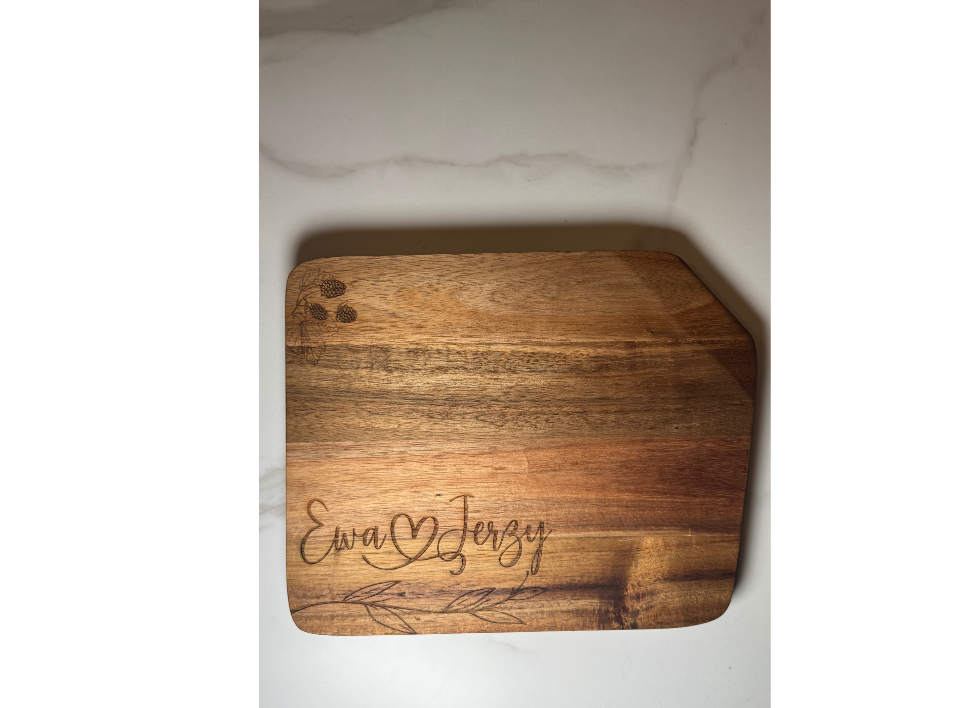 This beautifully crafted personalised chopping board features two engraved names joined by a heart, making it the perfect gift for weddings, anniversaries, or any couple’s celebration. In the top left corner, a delicate engraving of raspberries on a branch adds a charming, unique touch to the design.