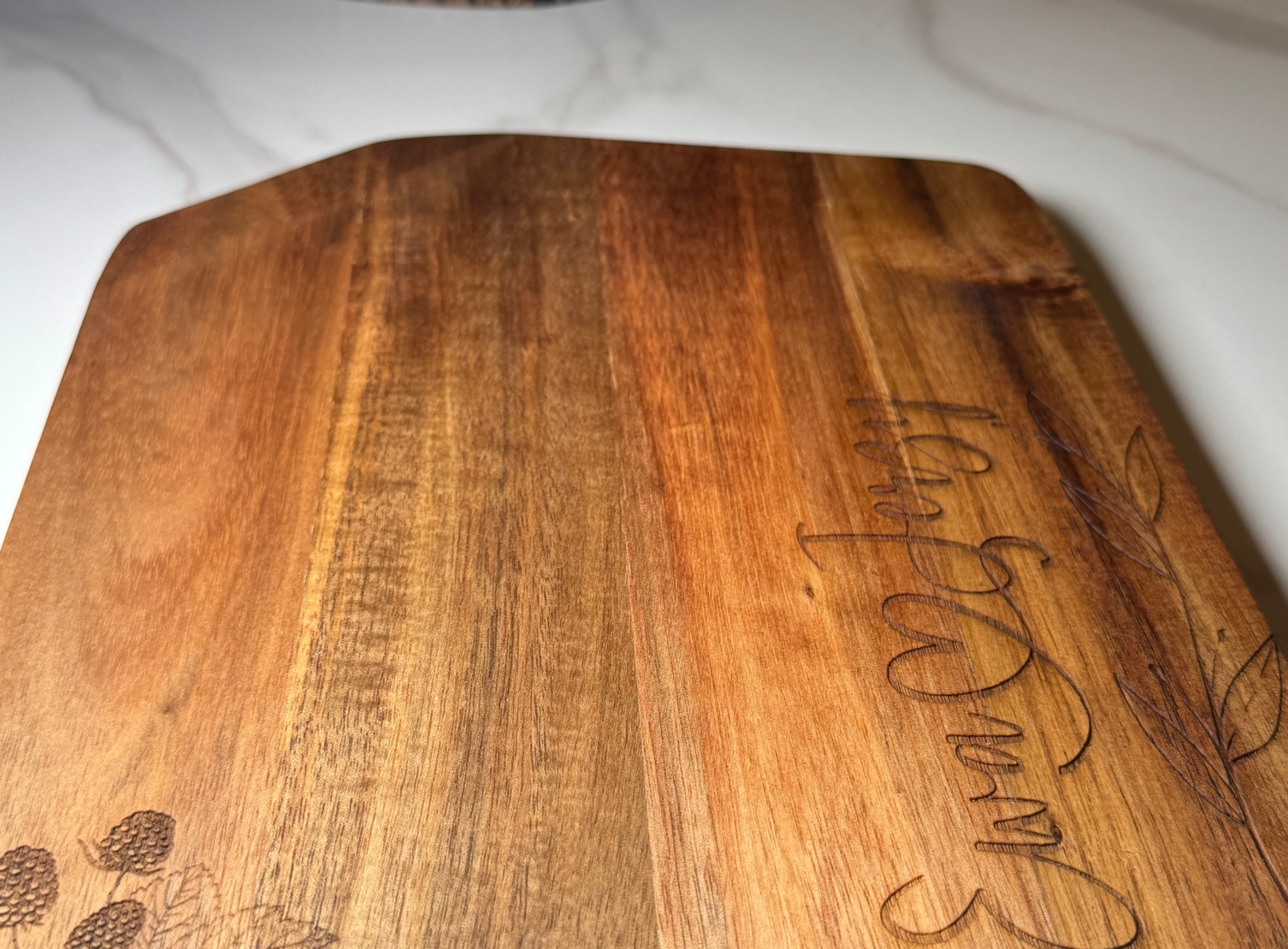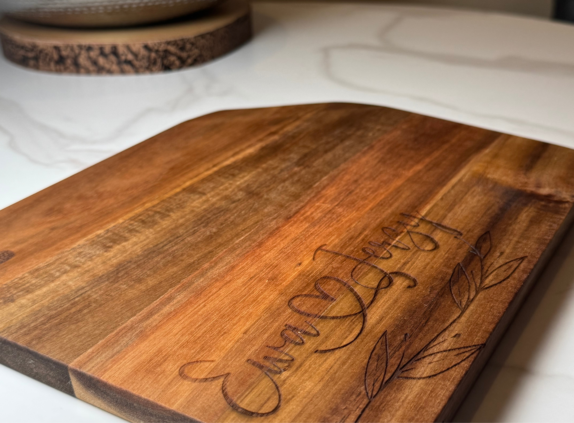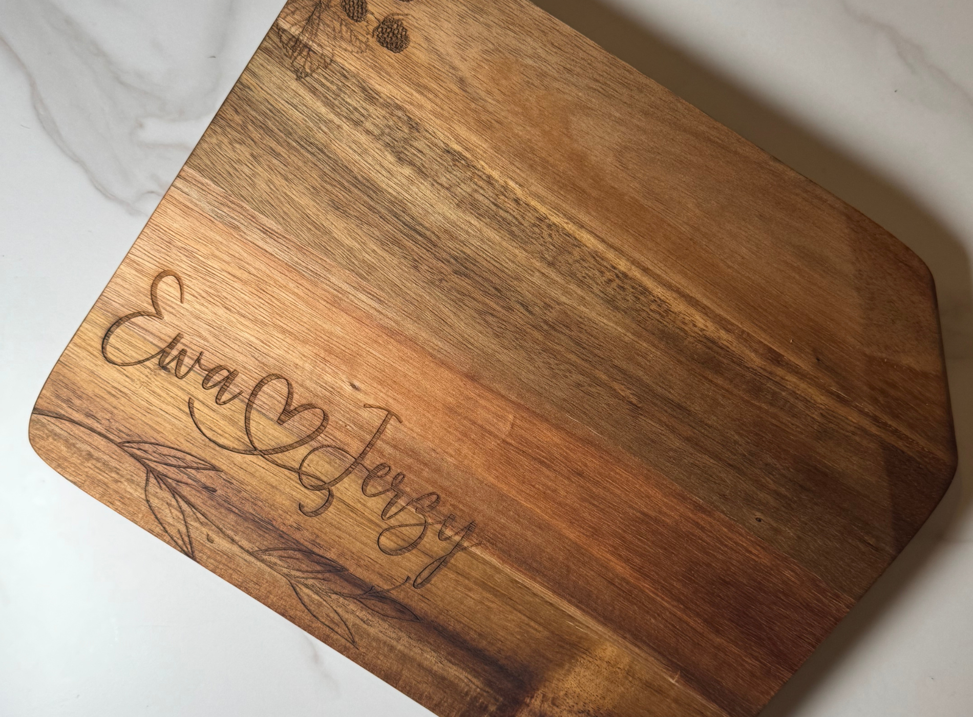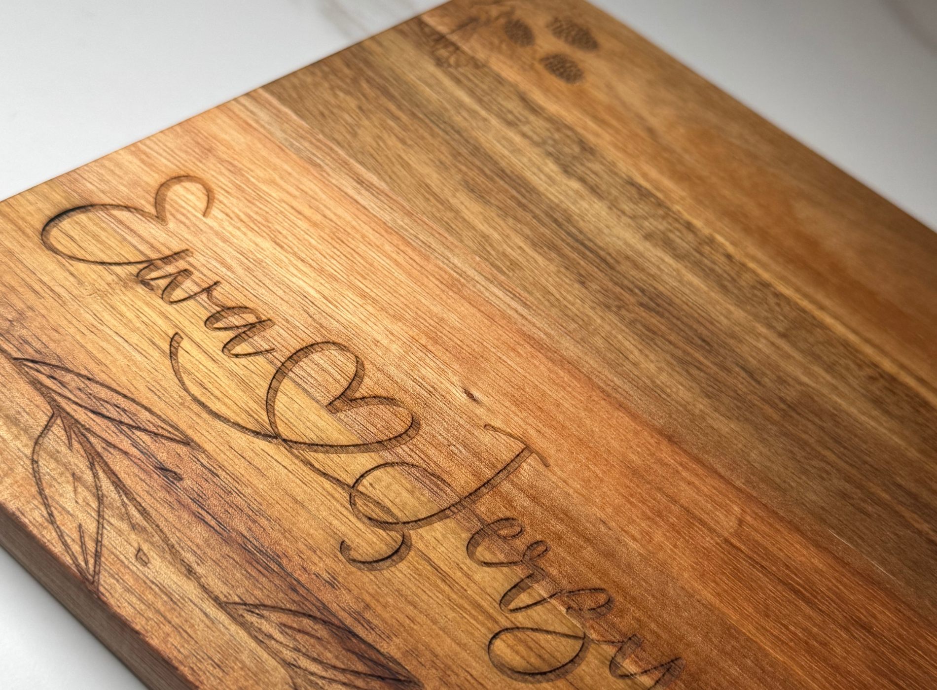 Made of solid acacia wood, this personalised chopping board is durable, natural, and gentle on your knives. Acacia wood is known for its strength and natural resistance to water, making this board a long-lasting addition to any kitchen. It’s a thoughtful and practical choice for anyone who loves to cook or entertain.