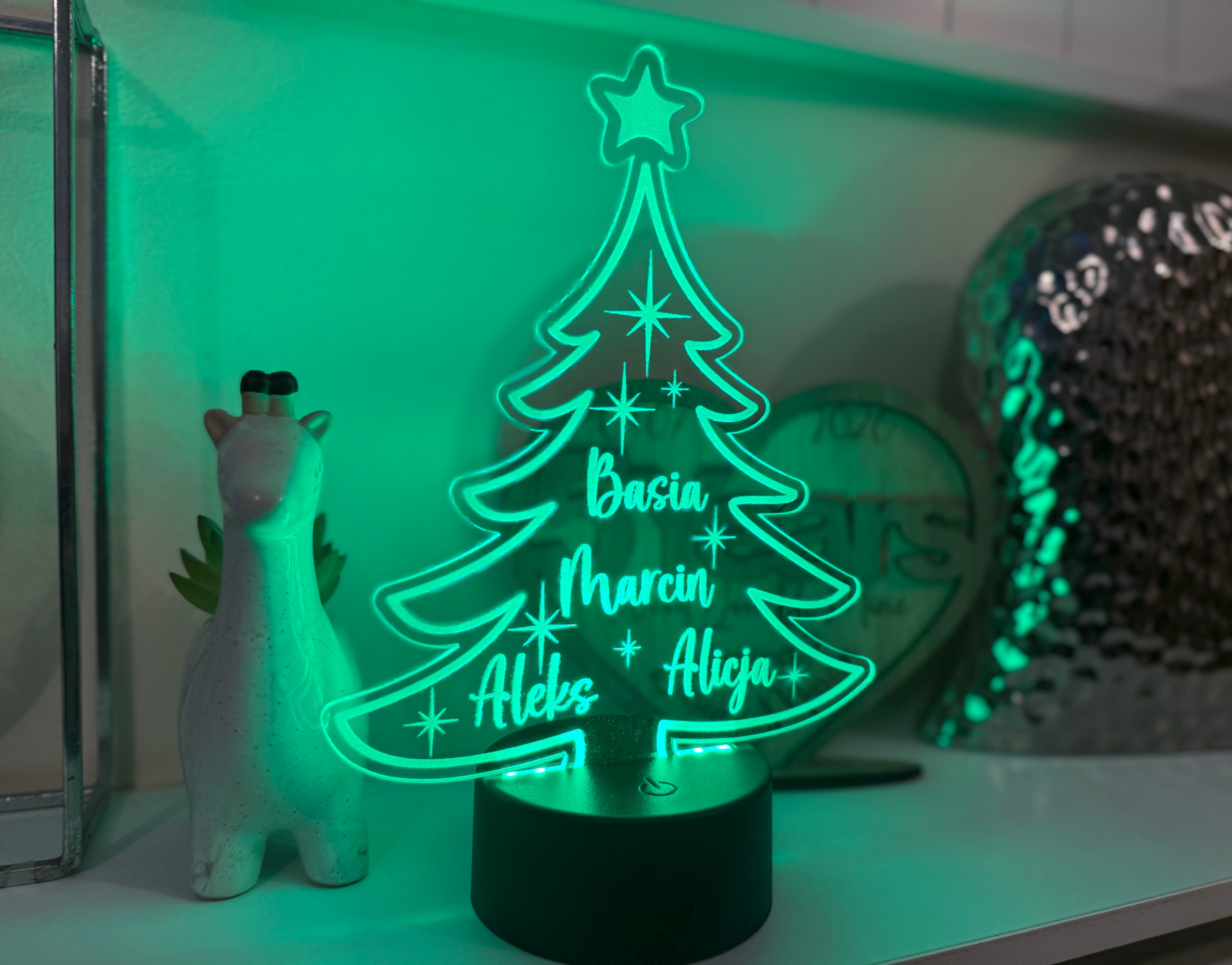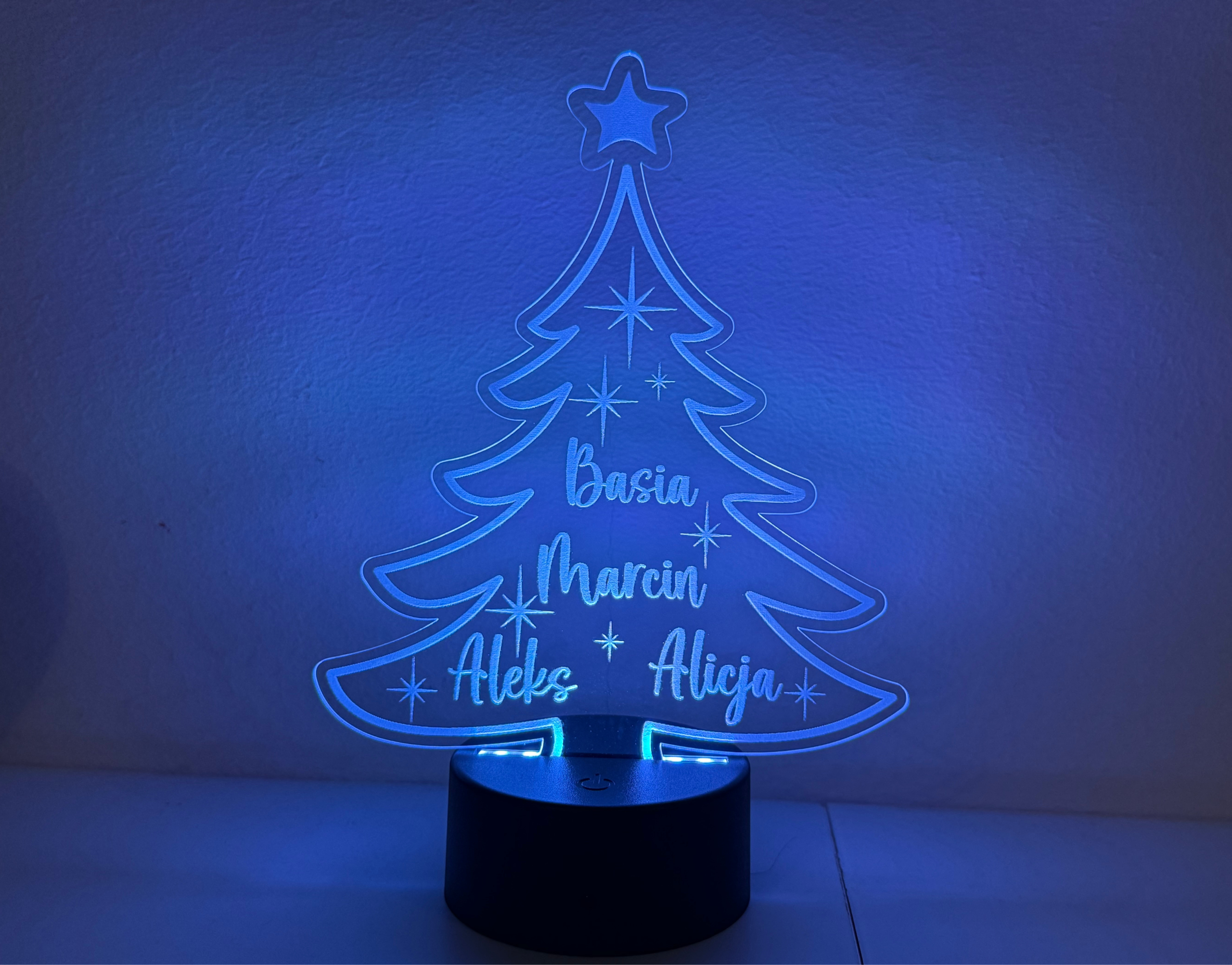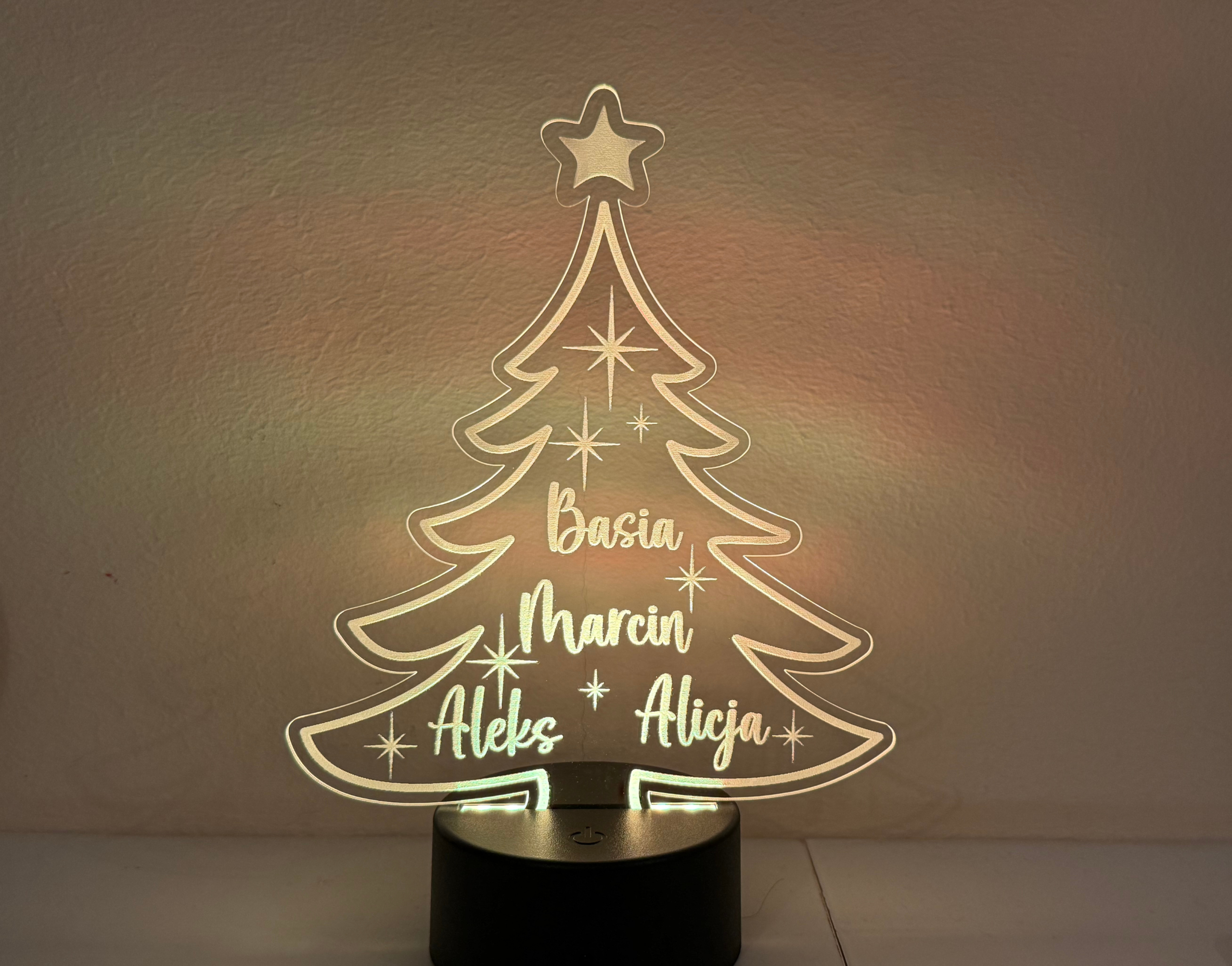custom LED Christmas tree lamp, family name night light, engraved acrylic Christmas light, RGB colour-changing night lamp, USB or battery night light, personalised Xmas gift for family, Christmas mantel decoration with names, UK handmade night light