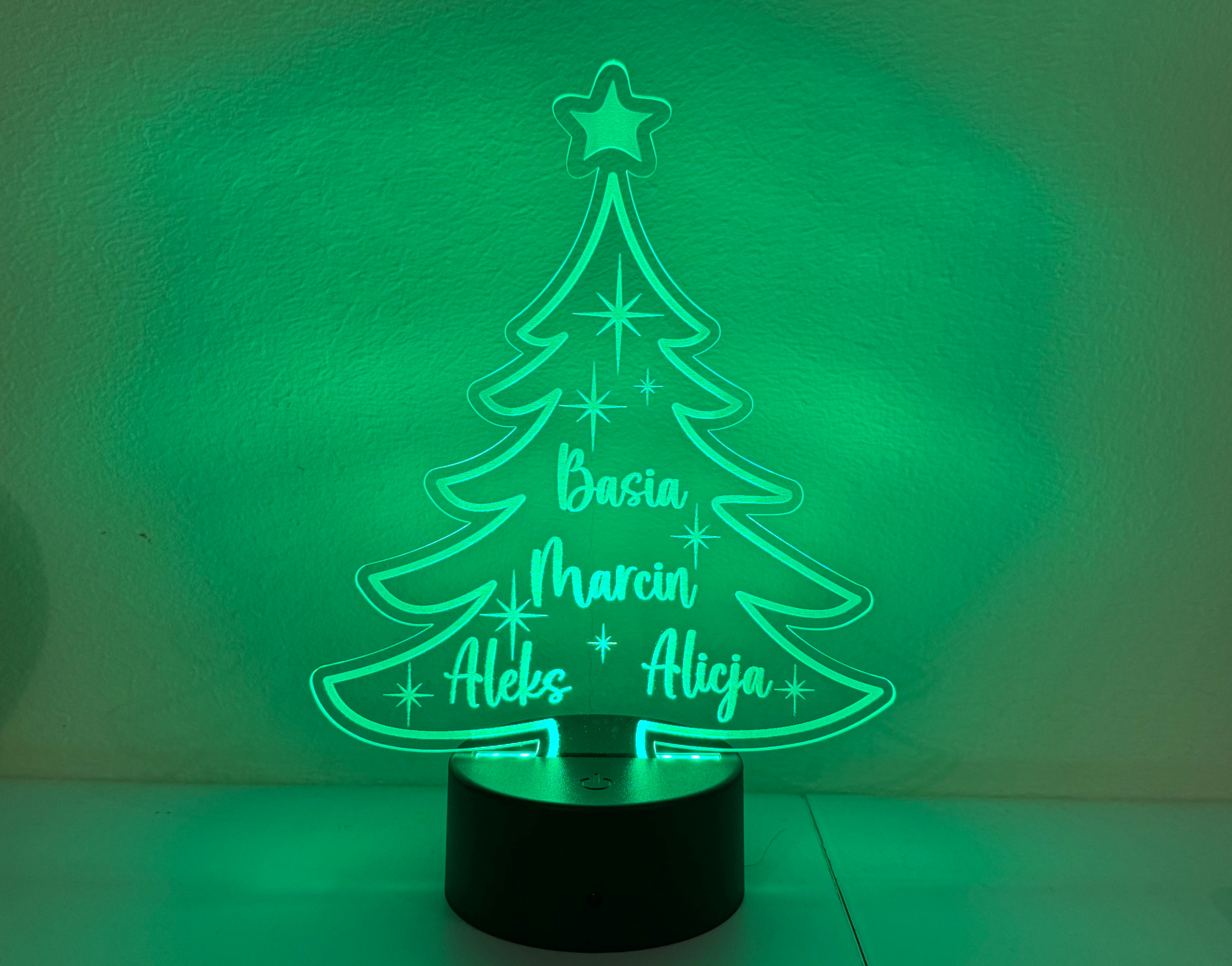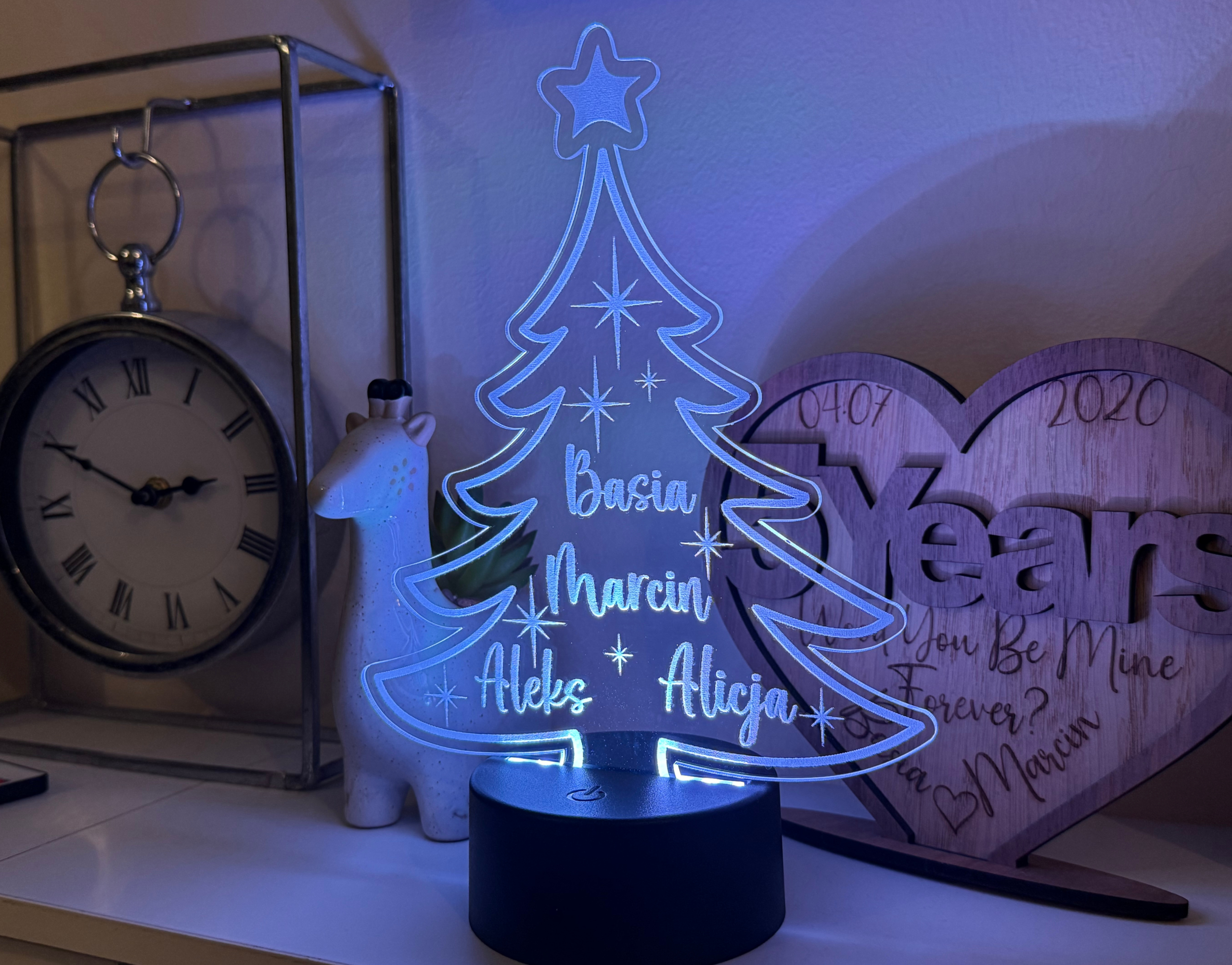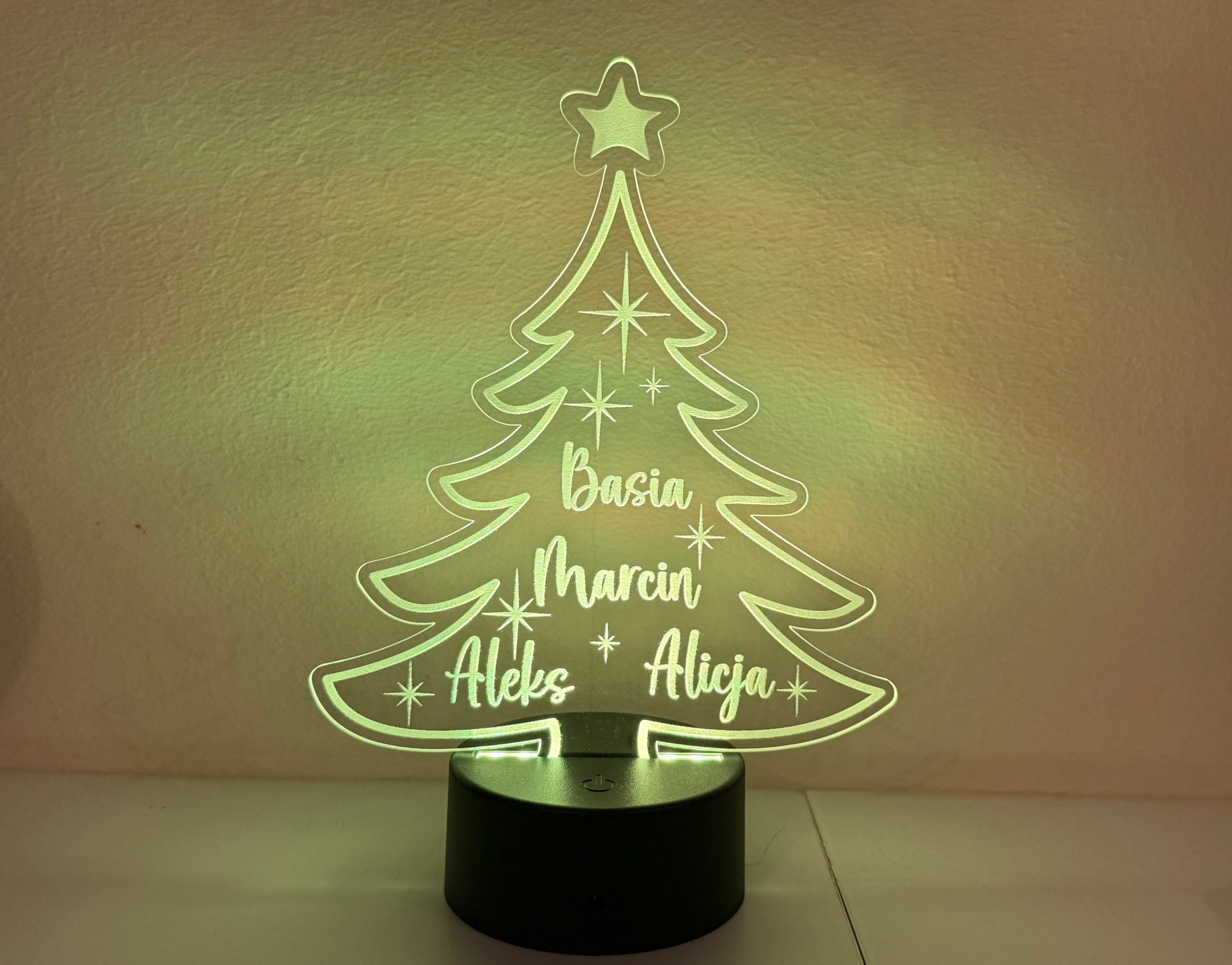 custom LED Christmas tree lamp, family name night light, engraved acrylic Christmas light, RGB colour-changing night lamp, USB or battery night light, personalised Xmas gift for family, Christmas mantel decoration with names, UK handmade night light